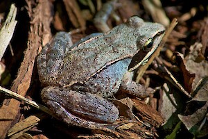 For organisms that don’t generate their own body heat, like reptiles, amphibians, and insects, winter poses a different set of challenges. Many reptiles and amphibians rely on behaviors to manage their body temperatures—like moving back and forth from sun to shade—but what do they do when those warm places aren’t so warm? Many enter a period called brumation, a type of dormancy similar to hibernation; though they cannot digest food, they must continue drinking water throughout the winter. Some snakes make use of natural holes or cavities, called a hibernaculum, to huddle up and wait out the cold weather. Some amphibians and most insects use one of two other options, embracing the cold (freeze avoidance) or freezing solid (freeze tolerance). Freeze avoidance means lowering the freezing temperature of the body’s fluids. They accomplish this by increasing antifreeze proteins in their blood, the same way we put antifreeze in our cars to keep the engine working. These antifreeze proteins and fewer particles for ice to form around prevent freezing and increase survival. On the other end of the spectrum, the wood frog burrows down into the leaf litter and turns itself into a frog-sicle. They also use internal antifreeze to prevent damage inside their cells, but allow the space between the cells to freeze. This, combined with effectively stopping breathing and heartbeats, allows them to wait out the winter and thaw as soon as spring temperatures are warm enough. This freeze tolerance is being studied for use in the medical world to improve human tissue preservation.